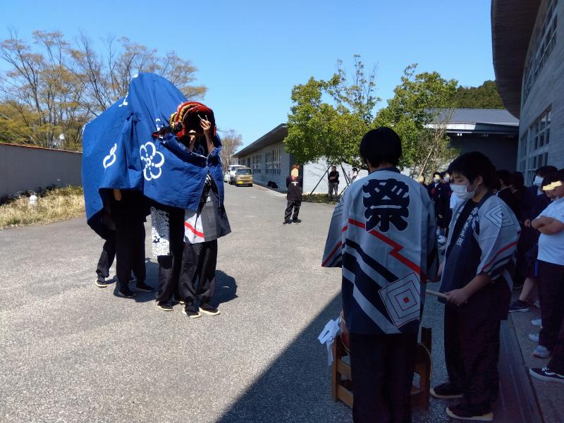 4.12の昼休みに錦町の獅子舞が本校に来ました。