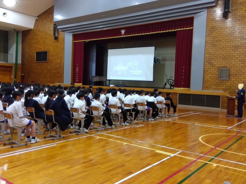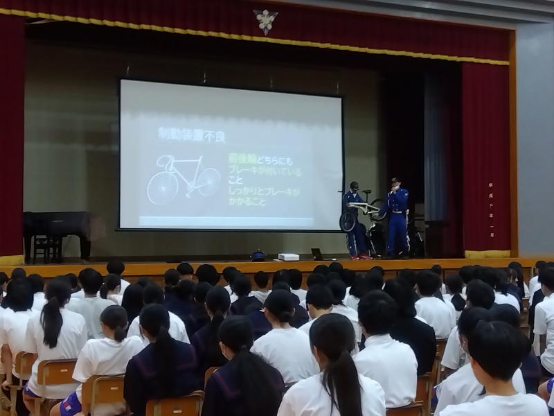大聖寺警察から交通安全課と交通機動隊の方に来てもらい、自転車についてのお話をいろいろな視点からしてもらいました。