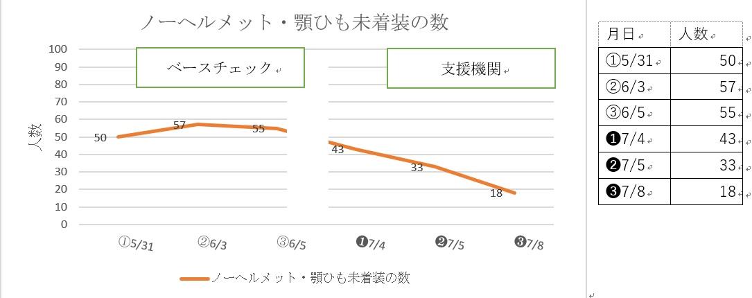 昨日までの結果ですが、先週金曜日に全校生徒に指導した成果もあると思うのですが、ノーヘル・顎ひも未装着の数は、3分の1にまで激減しました。