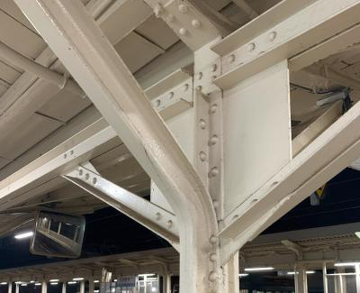 この曲った柱の部分ですが、アメリカ製の廃レールが再利用されているそうです。ほかにも梁の部分にも利用されています。鉄の塊のレールを上手に曲げているこの技術がすごいですね。