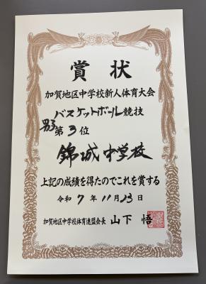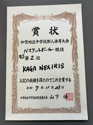生徒たちが一生懸命頑張ってくれて、私の名前が入った賞状を持ち帰ってくれたことです。加賀地区中学校新人バスケットボール大会は、小松市バスケットボール協会と加賀地区中学校体育連盟が主催の大会となります。今年度の加賀地区中学校体育連盟主催の大会はこれで終了です。