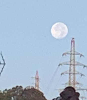 おはようございます。さわやかな朝を迎えています。きれいな青空。まん丸の月も沈むのを惜しむかのように西の空に浮かんでいました。