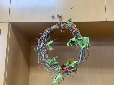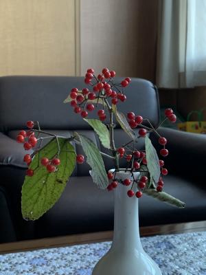 ノブドウの蔓にサルトリイバラの赤い実を飾ってみました。