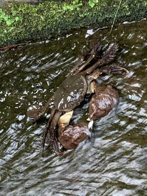 「モクズガニ」まだいるんですね。小学生の頃よく捕まえました。大きさは20cmは越えていたと思います。用水路にいました。過去に本校の裏の山際を流れる用水路にもいたことはあります。これを郷土料理として食べる地方もあるようです。カニ汁が最高だとも聞いたことがあります。