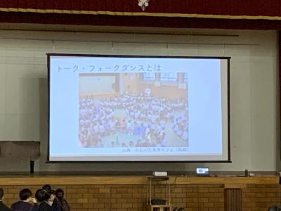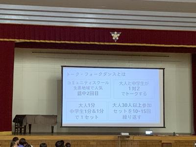 トークフォークダンスの説明です。フォークダンスのように生徒と地域の方が二重円にの隊形になります。地域の方は内側、生徒たちは外側の円となり、内側の円にいる地域の方がローテーションします。