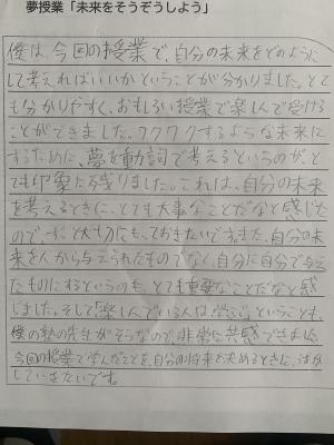 生徒の感想からは、了舟先生が伝えたかったことがしっかりと記述されていて、生徒たちも十分理解してくれたんだなと思いました。大成功ですね。