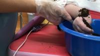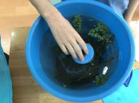 教員と一緒に布を輪ゴムで縛り、温泉の入った桶に手を入れ温かさを感じたり、布を泥の中に入れ感触を楽しんだりしている様子が見られました。