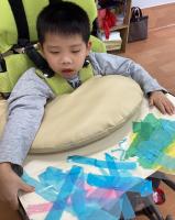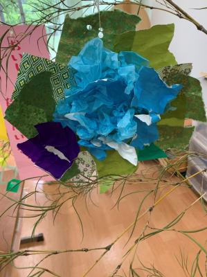 透明なシートの上にそっと慎重に花紙を乗せたり、小さくちぎったペーパーを上から散らしたりと楽しく制作する中で、花紙のふわふわな手触りを感じて笑顔になることも多かったです。