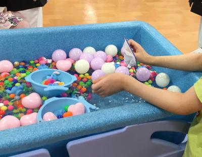 暑い夏に涼しさ、冷たさを感じようと登校日に「水・氷遊び」をしました。