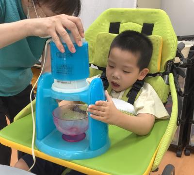 手動のかき氷器をがりがりと回し氷が出てくるのを楽しんだり、電動のかき氷器を押して振動を感じたり、保冷剤や氷にそっと触れてみたりしました。