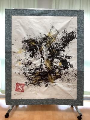 約1.5mの大きな作品は、最後に、障子のりに金色を混ぜて手で感触を味わいながら塗りました。
