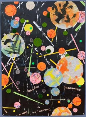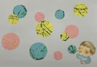 好きな色を2色選び、色の混ざり合う様子を見ました。出来上がった色画用紙を丸く切って貼り、素敵な模様のしゃぼん玉ができました。