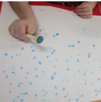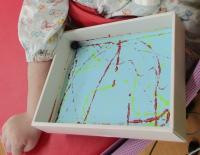 箱の中に色画用紙を敷き、その上に絵の具のついたビー玉を落として、箱の中で転がしました。