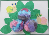 ビニール袋に花紙を入れてアジサイを作ったり、カタツムリの顔を描いたり、はっぱを切ったりして、雨を描いた画用紙に貼って作りました。