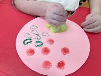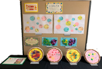 ビー玉転がしの模様で描いた「しゃぼんだま」、花紙を丸めて画用紙に貼った「ぶどう」、野菜スタンプや絵の具を付けた水ふうせんを台紙の上で弾ませて作った「いろいろピザ」の3点を展示しました。