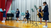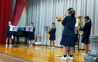 講堂にはたくさんの観客が聞きに来て、本番さながらに、「ジークフリード」と「コッツウェルズの風景」という曲を演奏しました。聞いていた子ども達からも、「たくさんの音色がきれいだった」などと感想が多く寄せられました。