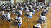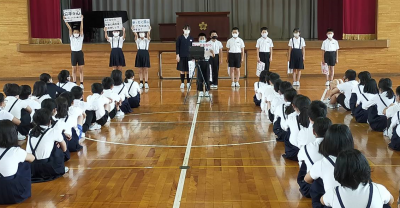 先日、6月の生活目標を伝える「全校朝会」が行われました。今回もコロナ対策の為、講堂に集まるのは5,6年生のみ、1~4年生は、各教室でリモート集会となりました。
