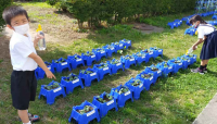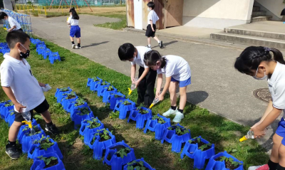 朝、玄関前にいると、たくさんの1年生が玄関前を行ったり来たりしています。水道でペットボトルに水を入れ、あさがおやさつまいもに水やりをしているようです。