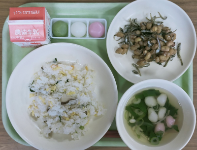 4月9日(金)今日は、給食がスタートして2日目です。メニューは、「お花畑ちらし寿司、大豆と煮干しのごまからめ、すまし汁、花見団子、牛乳」です。