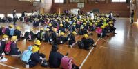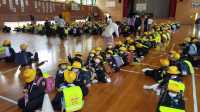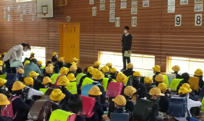 4月13日(火)に、「集団下校訓練」が行われました。体育館の壁には、町の名前と数字が掲示されており、子ども達は自分の町名に整列して待ちました。