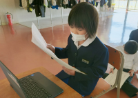3月11日(木)1年生の教室をのぞいてみると、一人1台のパソコンに向かい、何やらしゃべっています。何をしているのかな?と見ていたら、どうやら、自分で書いた作文を発表する練習をしていたようです。