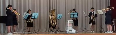 金管楽器と木管楽器に分かれ、2つのグループが、きれいな音色を聞かせてくれました。いつもの賑やかな体育館・講堂とは打って変わって、ゆったりとした優雅な曲に聴き入っていると、何となく心まで豊かになってくるような気がしてきて、とても不思議でした。やはり、美しい音楽は、人の心にとても良い影響を及ぼすのでしょうね。
