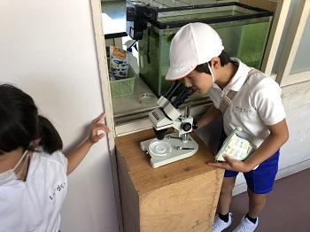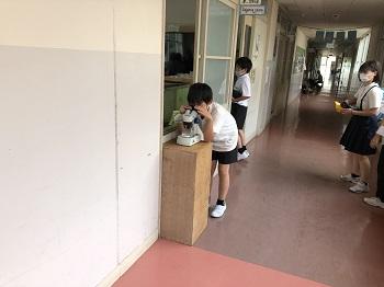 子どもたちが社会の出来事や自然などいろいろなものに興味を持ってくれることを願って、先生たちはいろいろな仕掛けをします。それは授業中や教室の中だけではありません。今日、1階の理科室前の廊下に顕微鏡が置いてありました。レンズをのぞいてみると、そこにはメダカの卵が見えます。メダカは5年生の勉強ですが、休み時間には学年関係なく、何人もの子どもたちが、一生けん命にレンズをのぞいていました。