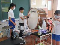 ブラスバンドの楽器体験がありました。5,6年生の先輩が4年生に優しく楽器の演奏の方法を教えていました。会議で少し遅れて行ったので一部しか見られませんでしたが、4年生は実際にティンパニや大太鼓をたたいたり、マウスピースを吹いたりして楽しそうでした(手ぶくろと消毒でコロナ対策もしっかりしていました)。6月からは新しいメンバーも加えて、新曲の連取も始まるようです。今年もブラスバンドの活躍が楽しみですね。