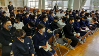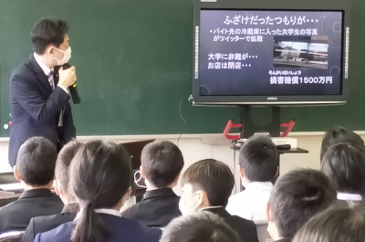 少し日は遡りますが、12月22日(火)に、6年生を対象とした、「非行被害防止講座」が開催されました。小松教育事務所、笹川指導主事が講師となり、実際に起こった恐ろしいネットトラブルについてご講話していただきました。