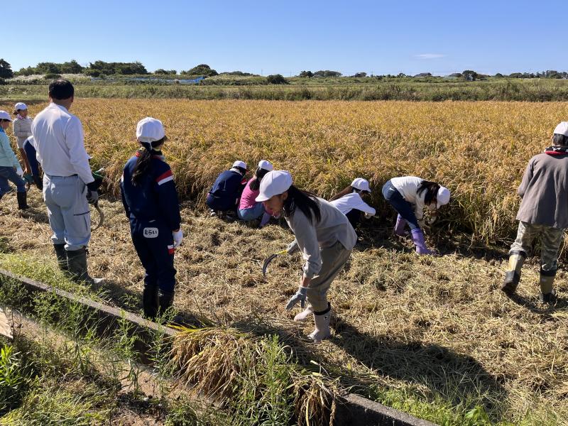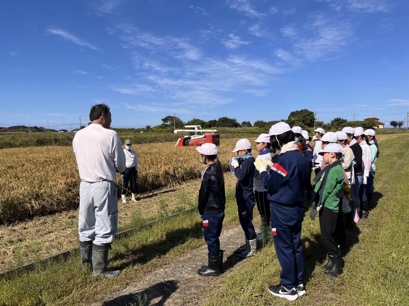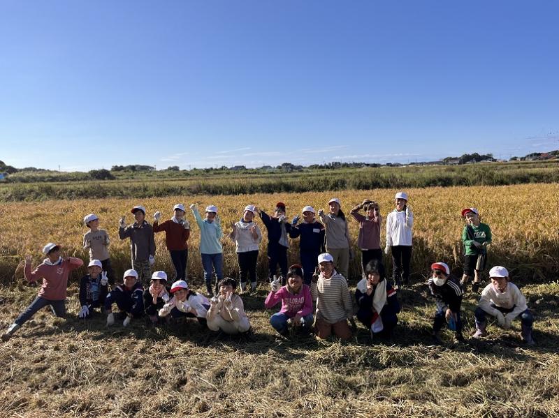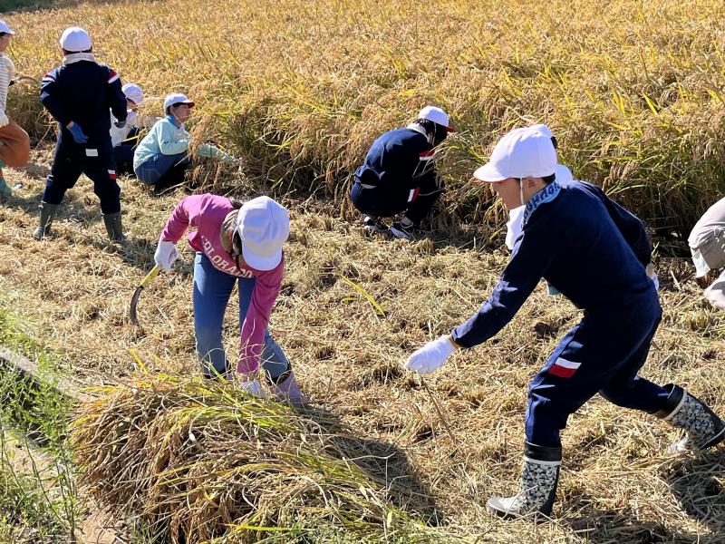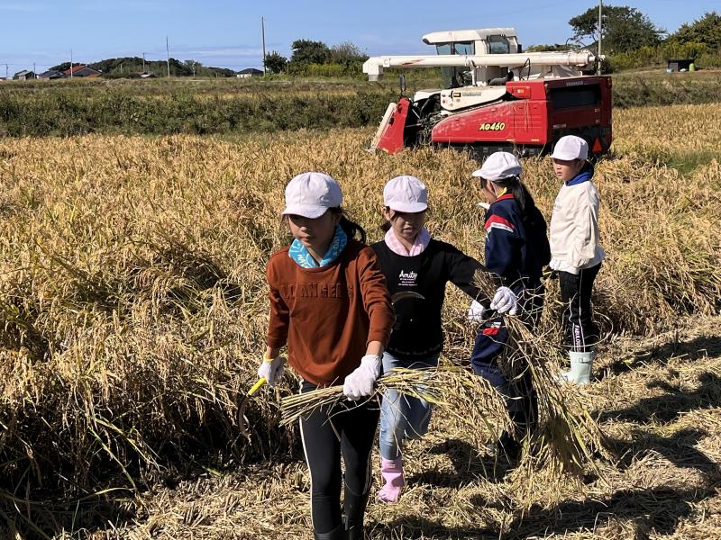 自分たちで稲刈りをして、大変な作業であると実感しました。そして最近の農業の機械の進化も見せていただき、子どもたちは感動していました。長靴や体操服が泥やわらなどでたくさん汚れましたが、充実した体験ができました。堀さん、ありがとうございました。