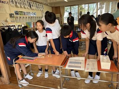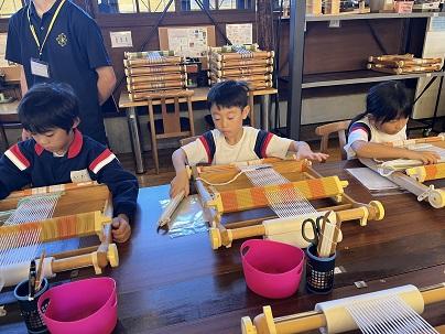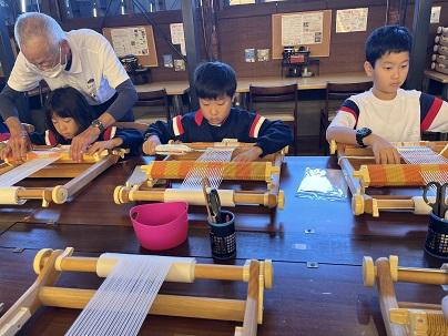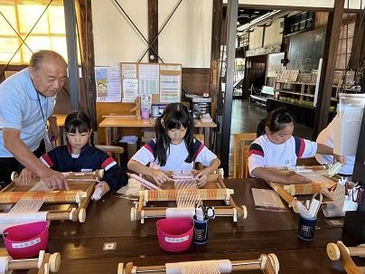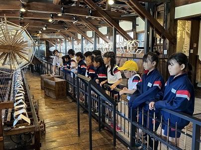 3,4年生は10月10日、校外学習に出かけました。行先は、福井方面です。始めに「ゆめおーれ勝山」に行き、コースターづくりをしました。自分の好きな色の糸を織り、とてもきれいな作品ができました。(学校に戻ってきた3,4年生は、そのコースターを見せたくて、迎えに出た先生たちに見せてくれました。)織物や糸、絹糸のことも教えてもらい、織り機などを見学しました。