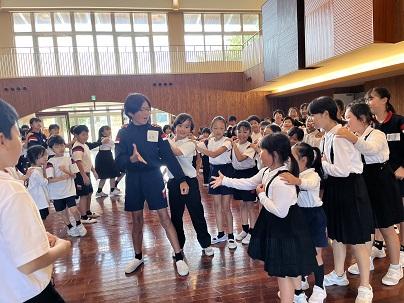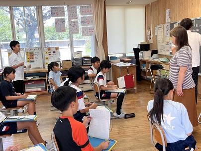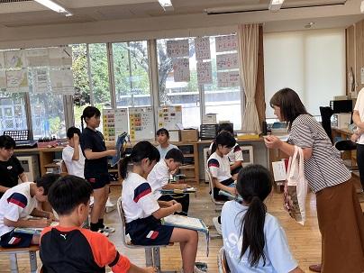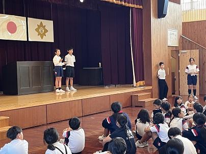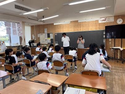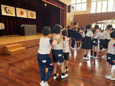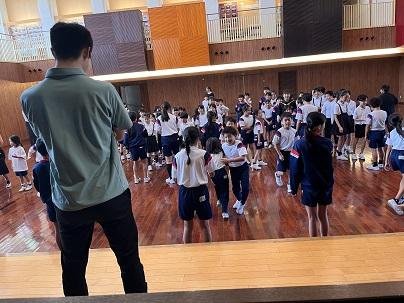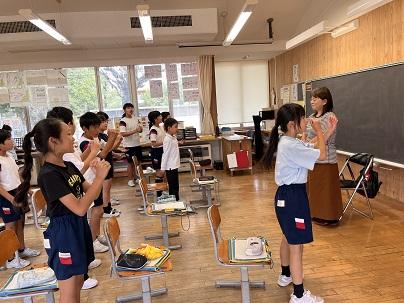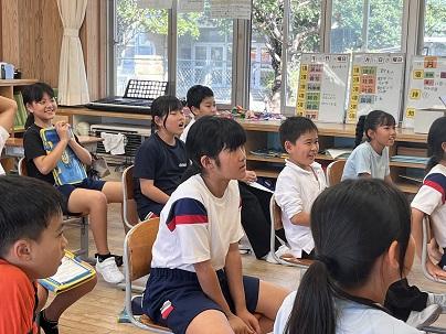 はじめに、4年生が講師の先生へお迎えの歌「すばらしい金明」を歌いました。講師の先生は、その歌を聴きながら涙を流していました。歌のあと、講師の先生からは「悲しい涙じゃないよ。みんなが一生懸命、私に歌ってくれたことがうれしくて。うれしい涙だよ。」と話されました。