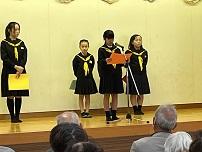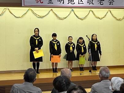 10月20日は、金明地区の敬老会でした。たくさんのおじいさん、おばあさんの前で、金明小の5名が作文を披露しました。日頃お世話になっているおじいさんやおばあさんに、感謝の気持ち、長生きしてねのメッセージなど思いを込めて発表しました。おじいさんやおばあさんたちは、金明小の5人の作文を聞いて、とてもうれしそうでした。