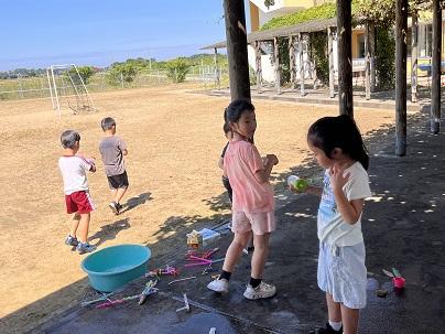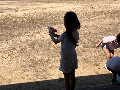 1年生の生活科では、学習課題「なつのあそびをたのしもう」で、シャボン玉を作って空に飛ばしたり、水鉄砲で水を飛ばしたりしました。外で思いっきり走り、水をかけあった1年生は、最後にこの遊びで気づいたことを振り返りました。