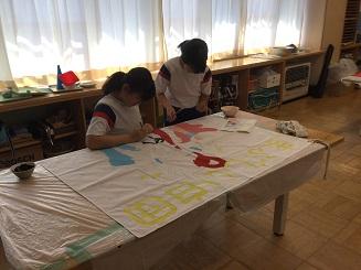 そして、高学年の児童は、長休みに準備をしています。スローガンや団旗の制作もしています。