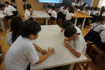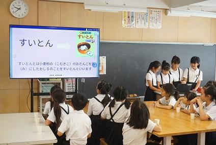その思いを受けて、全校児童が4年生の発表や読み聞かせに耳を傾け、そして思いを込めて「平和の子ら」を全校合唱しました。また、すいとんを試食し、自分たちの今食べているものとの違い、そして食の大切さを感じ、戦争中の生活に思いをはせていました。