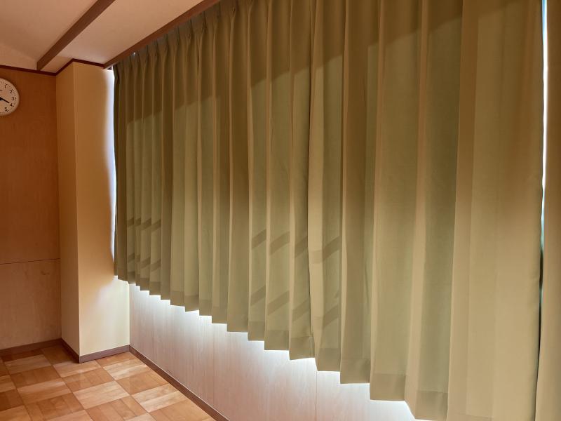2階に上がる階段の前に、ソファを設置しました。また、2階視聴覚室の扉や柱の色を変えたり、カーテンを変えたりしました。児童のみんなが明るく楽しい気持ちになるように、そして学びたくなるように、考えました。