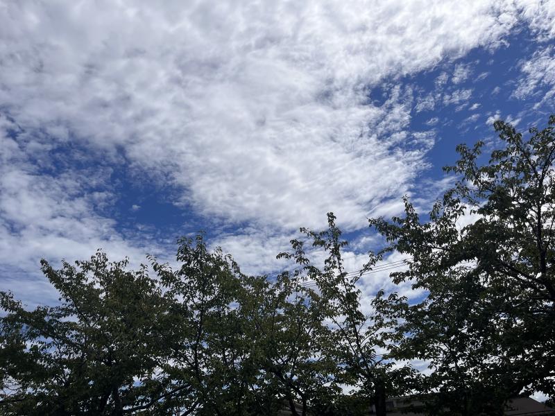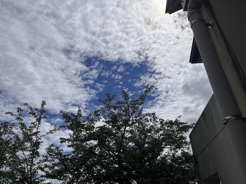 今、学校から見える空の様子です。雲が空いっぱいに広がっています。