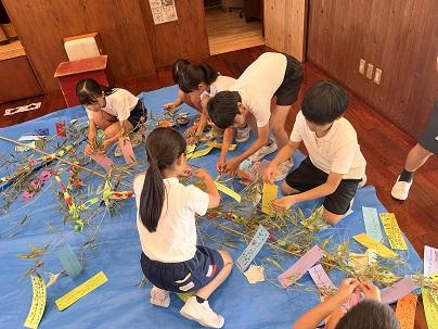6年生が1年生の補助をして、短冊を飾りました。また、2年生がたくさんの飾りを作ってくれて、華やかになりました。
