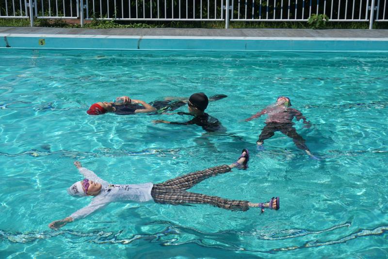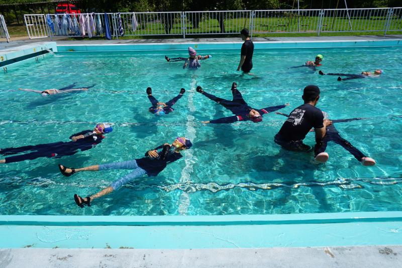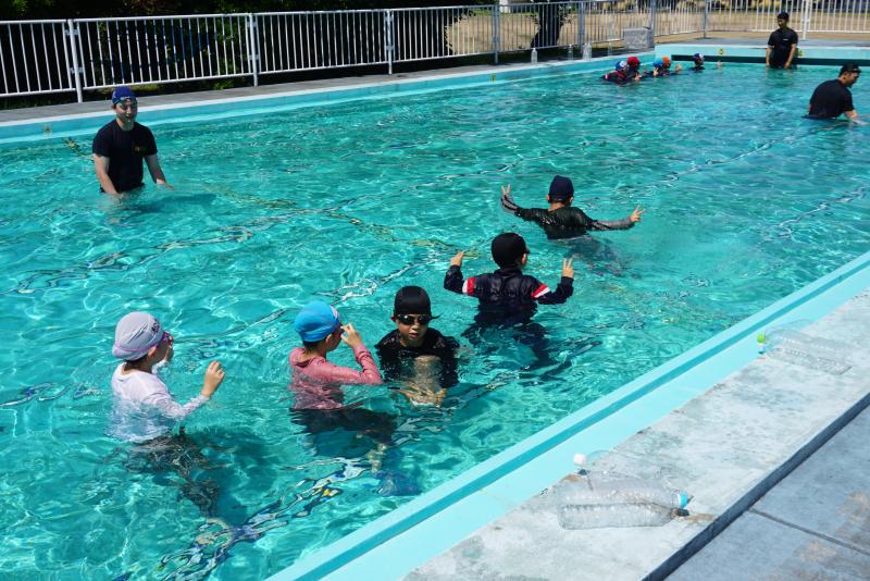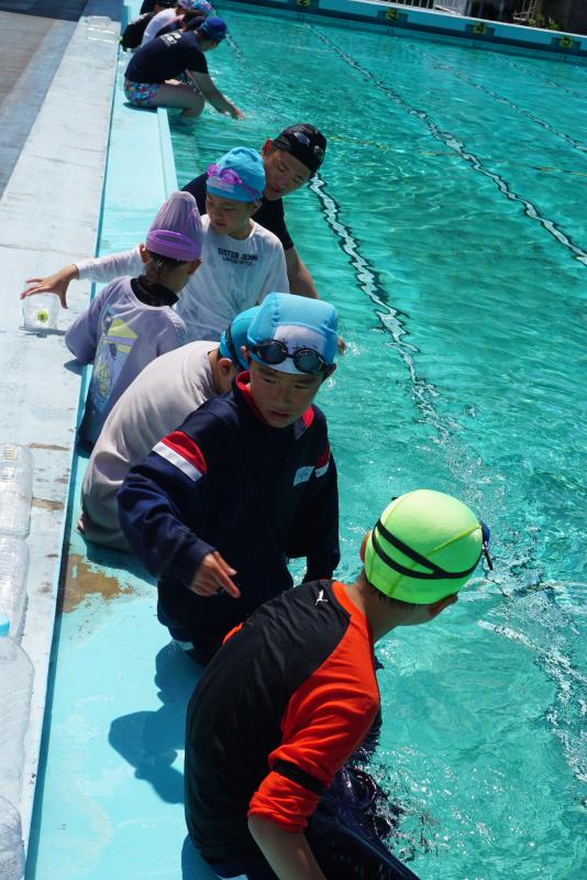 その後、背浮きの練習をしました。ペットボトルを胸に抱えたり、何も持たず大の字になったりして、浮きます。4年生はとても上手で、3分間しっかり浮き続けました。