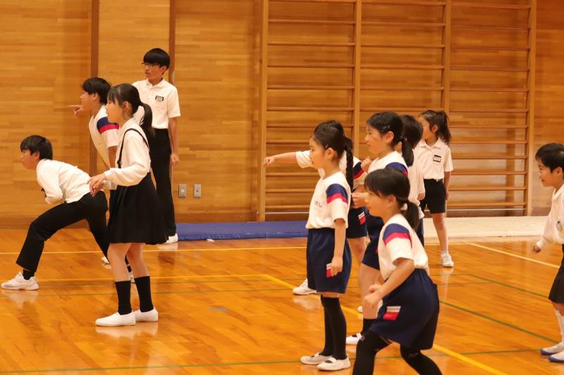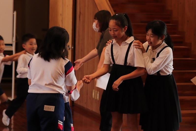 初めに、運動会の団の色を抽選しました。団長の登場からくじ引きまで、ドキドキしながら全校で見守りました。団の色が決まったら、ふれあいタイムです。「だるまさんが転んだ」や「じゃんけん列車」などをして、みんなで楽しみました。