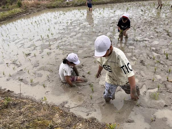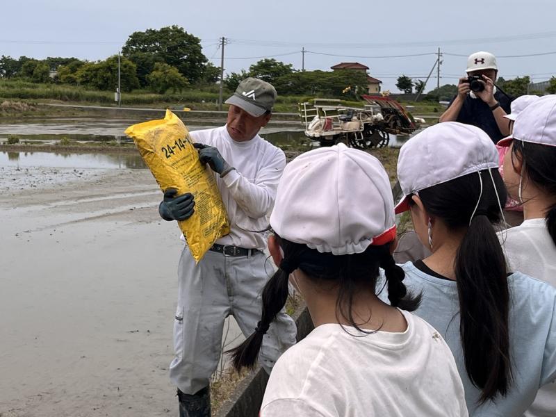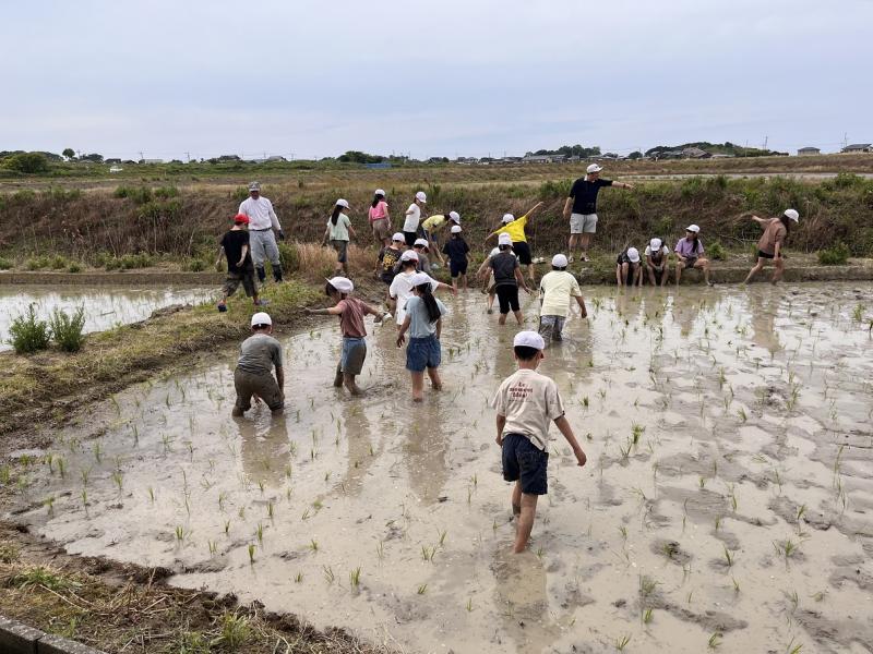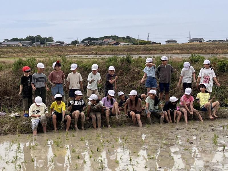 先週は雨が降り、延期になっていた5年生の田植え体験をおこないました。農家の方の協力で、「ひゃくまん穀」の苗を植えました。初めは、田んぼに入ると「きゃー」という声が聞こえていましたが、田植えが進むうちに「苗をもっとください」「ここも植えたい」と意欲がいっぱいになりました。時には、足が田んぼから抜けなくて尻もちをついたり、泥が体にたくさんついたりと大変でしたが、とても楽しそうでした。最後に田植え機も見せてもらい、進化している機械の様子も知ることができました。早く、稲刈りがしたいです。
