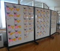 オープンスペースでは笑顔カードの展示を行っています。また、廊下には図工の作品(立体や絵)も並んでいます。