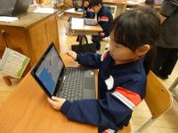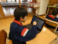 1年生がプログラミングをしました。図工の時間に、「ビスケット」というソフトで、水族館をつくりました。