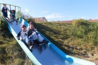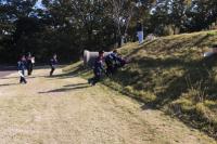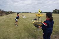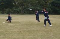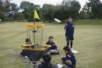 ピザでお腹がいっぱいになった5,6年生は、午後からディスクゴルフをしました。芦原青年の家の広い芝生広場で、6コースのフライングディスクをしました。ゴルフなので、ゴールの入れ物に入るまで、何回投げたかで勝負します。