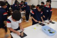 その後、レザークラフトを体験しました。レザーに型と木づちでマークや模様、文字を刻印しました。色付けもして、キーホルダーにしました。最後の金具付けが難しかったかな。素敵な作品ができました。