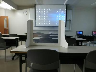 紙製の卓上パーテーションを使いました。(上が開いているので、スクリーンを見るには良かったです。各自が机に両面コピーで設置。終了後は記念に持ち帰る人が多かったです。)