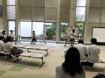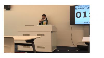 9月19日放課後、玄関ロビーにて第11回校内ビブリオバトルが行われました。バトラー(紹介者)がお気に入りの本を5分間で紹介し、その後、ギャラリー(参加者)の質問に答えるというビブリオバトルの形式で進行しましたが、今回はバトラーが2名と少なかったため、最後はチャンプ本を決めるのではなく、すばらしいプレゼンをしてくれたバトラーのふたりに参加者が拍手を送ってイベントを終えました。バトラーはそれぞれ話し方やジェスチャーなど工夫しながらギャラリーに問いかけたり本の魅力を伝えたりしていて、参加者と本とのすてきな出会いの場となりました。