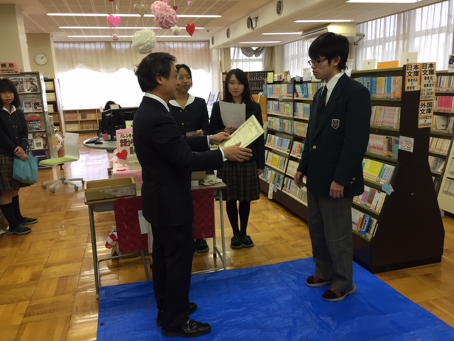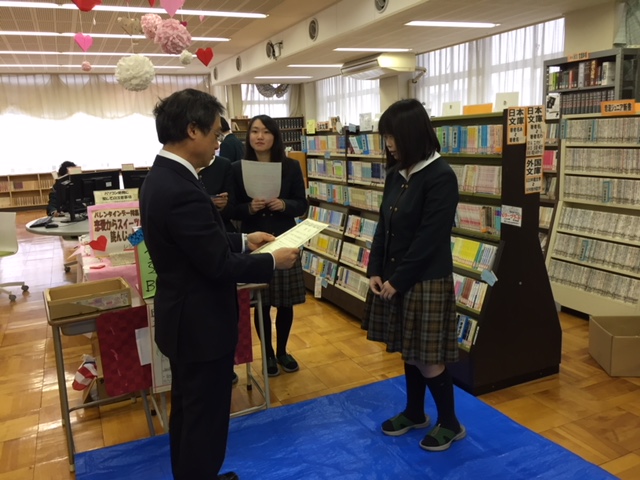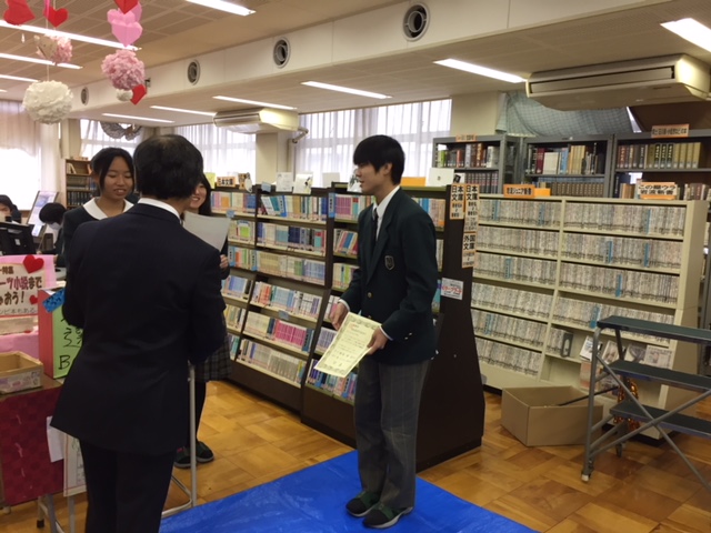 1月29日(月)昼休み、スタンプラリー抽選会の後、ベストリーダー賞(多読者賞)の6名に賞状と賞品を贈呈しました。当日は校長先生より授与。