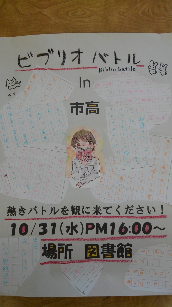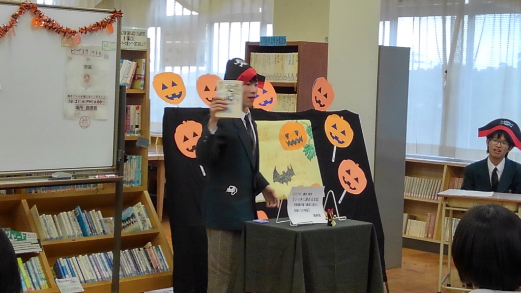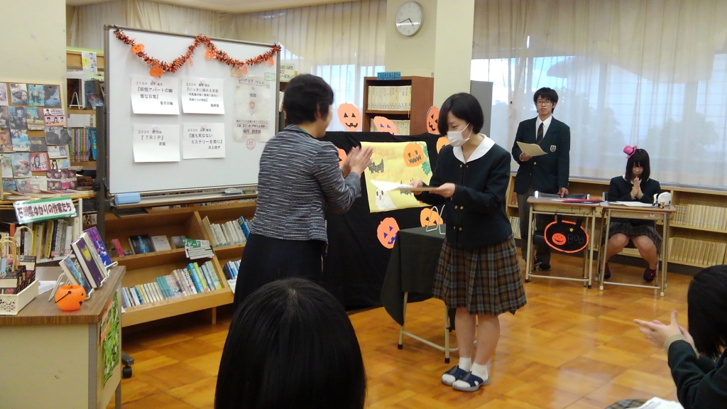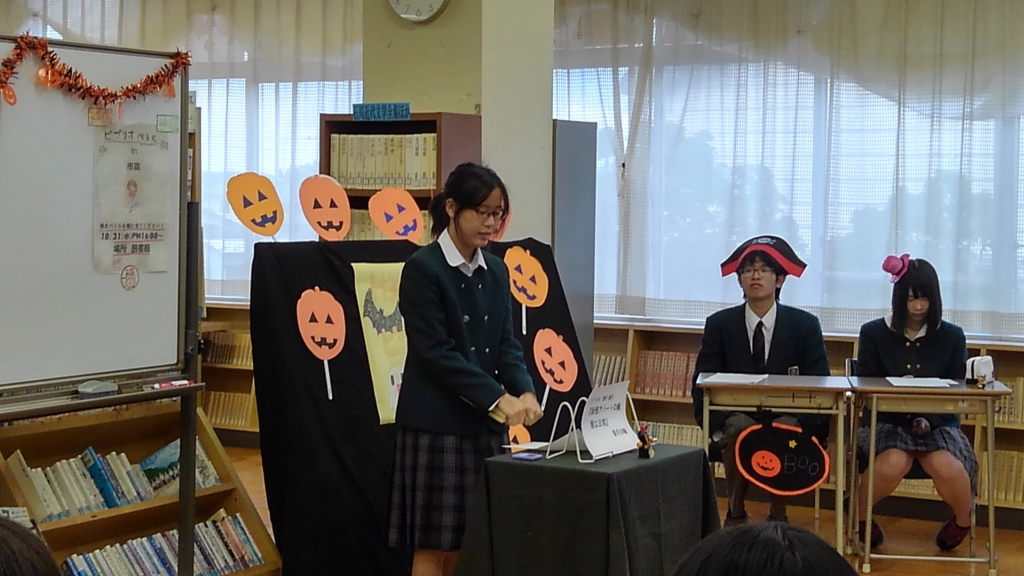 10月31日(水)放課後、図書館で今年は5回目となった校内ビブリオバトル大会が行われました。今回も図書館はハロウィンの雰囲気に彩られ、4人のバトラーがそれぞれイチオシ本を紹介、最後にどれが読みたくなったかギャラリー(来場者全員)が投票して、チャンプ本を決めました。